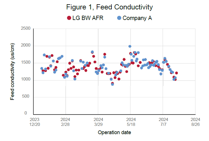 Under high fouling conditions, the LG train’s average permeate flow was 6.7% higher than that of Product A’s train. Furthermore, the recoveries of the LG and Product A’s trains are around 70.1% and 55.9%, respectively, indicating that the BW 400 AFR membranes can treat more water for reuse at the power plant (see figure 2).