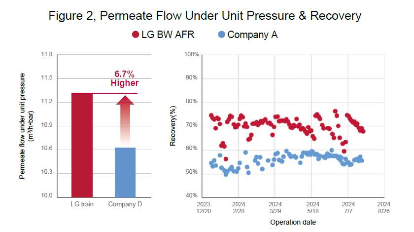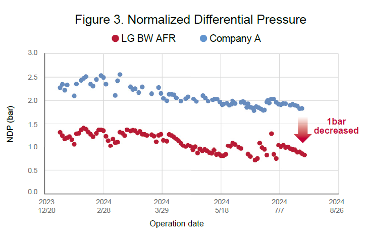 The RO system, which began operation in May 2021, has been running efficiently for over three years. The operation time of the train installed with LG BW 400 AFR membranes is 1.5 to 2 times longer than that of the Product A train installed with Company A’s anti-fouling membranes. LG BW 400 AFR demonstrates a considerably extended membrane service life (see Figure 1)